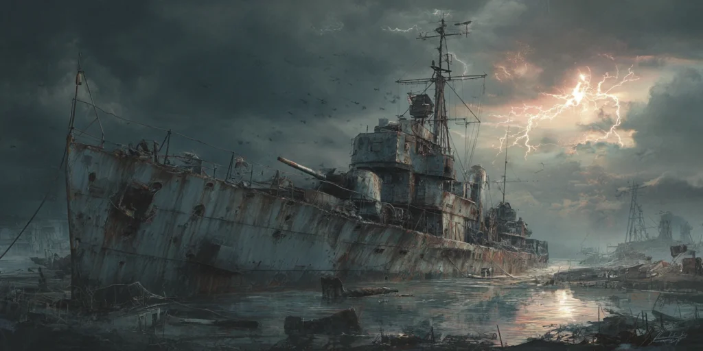 一艘破损至几近断裂的军舰撞上拉脱维亚北部荒滩。甲板满是弹孔与烧痕,信号灯持续闪烁求救代码,舰身涂有泥沙与碎片,但无一人生还。